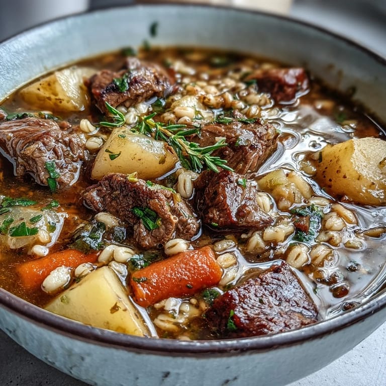 Save to Pinterest There's something about the smell of beef browning in a pot that makes you feel like you're actually cooking something worthwhile. My dad used to make this soup on cold Sundays, and I'd watch the barley plump up in the broth like tiny, patient promises of comfort. One winter I finally asked him for the recipe, thinking it would be complicated, but it turned out to be beautifully straightforward—just beef, vegetables, and time doing most of the work.