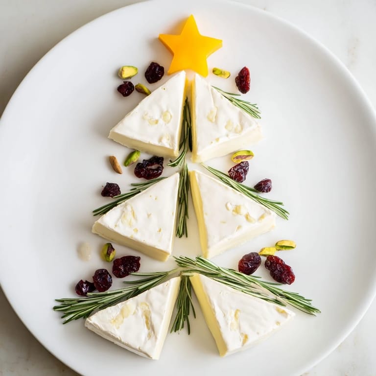 Save to Pinterest A festive and elegant cheese display featuring creamy Brie wedges arranged in a tree shape, perfect for holiday gatherings or entertaining.