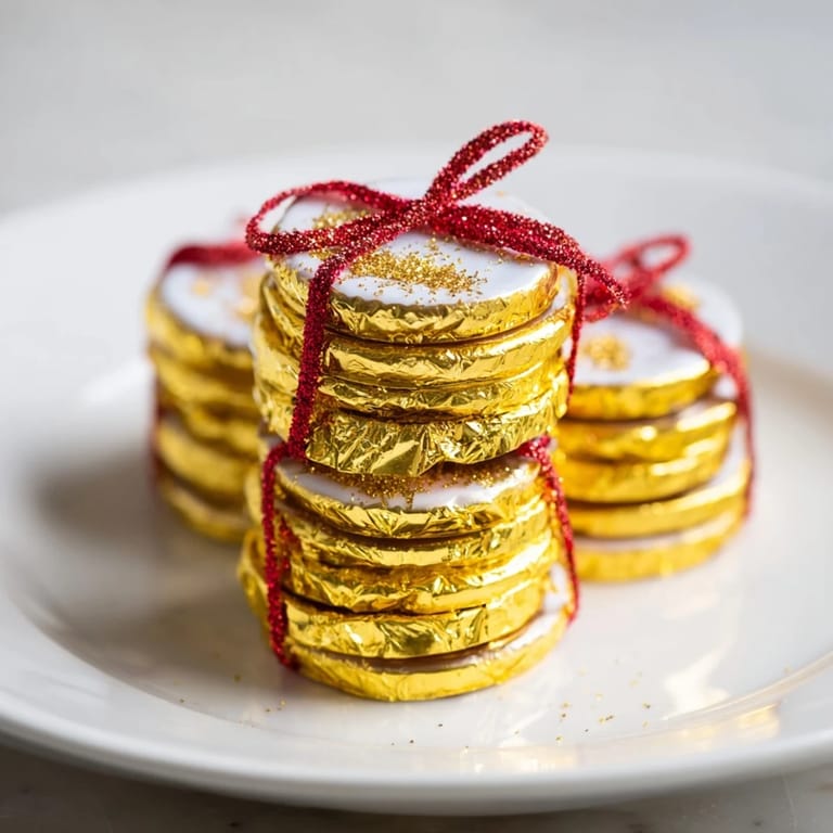 Save to Pinterest A festive and eye-catching centerpiece featuring stacks of shimmering chocolate gold coins, perfect for holidays, parties, or special events. This no-bake treat is both decorative and delicious, bringing a touch of whimsy and sweetness to any table.