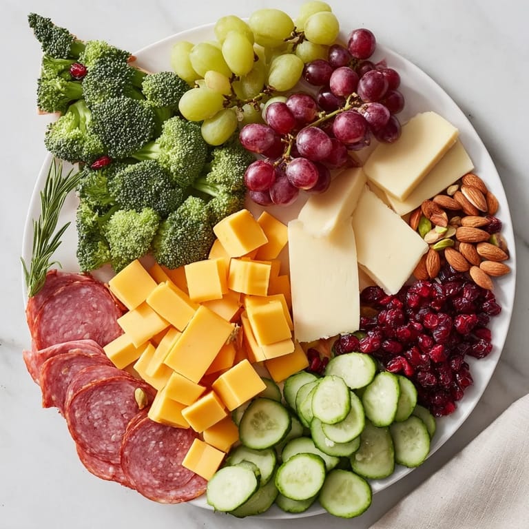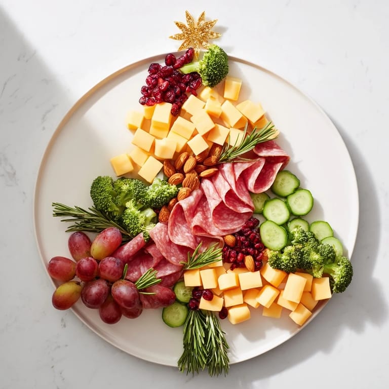 Save to Pinterest A festive and visually stunning snack board arranged in the shape of an evergreen tree featuring cheeses charcuterie fruits nuts and crackers perfect for holiday entertaining.