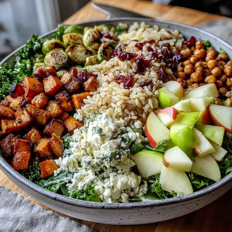 Save to Pinterest Embrace the vibrant flavors of the season with this Fall Harvest Bowl. This nourishing autumn-inspired meal features a hearty blend of kale, wild rice, roasted sweet potatoes, and Brussels sprouts, complemented by crispy chickpeas, fresh apples, and crunchy celery. Topped with toasted almonds and creamy feta cheese, it is the perfect wholesome dish for a crisp day.
