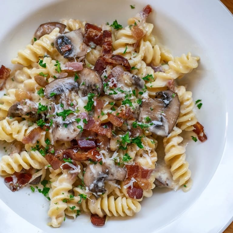 Save to Pinterest A comforting pasta dish featuring smoky bacon, sweet onions, and earthy mushrooms in a savory sauce, ready in just 30 minutes.
