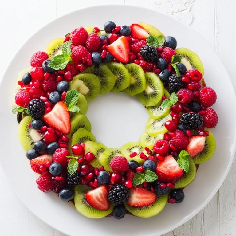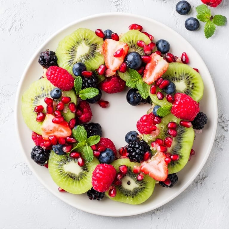 Save to Pinterest A festive and vibrant fruit platter arranged in the shape of a wreath featuring juicy kiwi slices and an assortment of fresh berries perfect for holiday gatherings.
