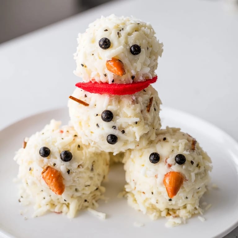 Save to Pinterest A whimsical and festive appetizer featuring three creamy cheese balls shaped and decorated as cheerful snowmen—perfect for holiday gatherings.
