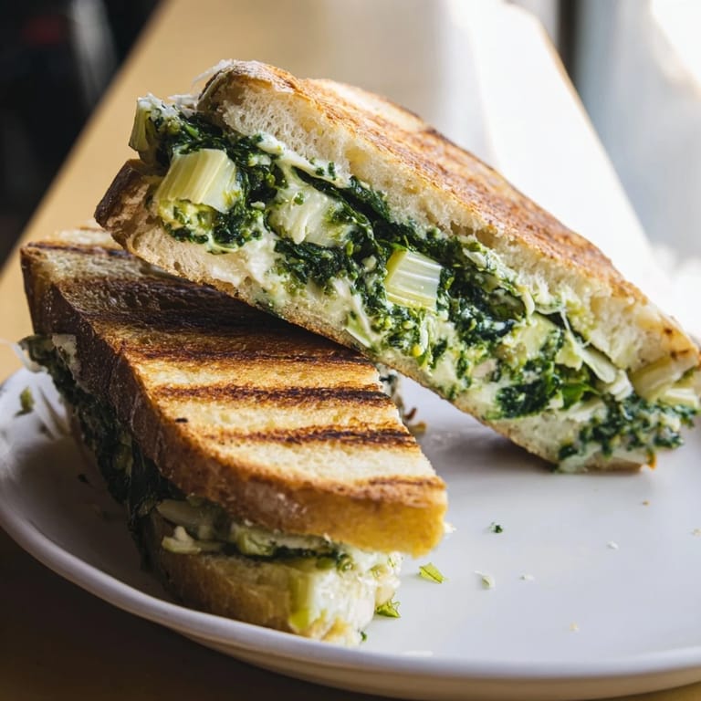 Save to Pinterest A decadent grilled cheese sandwich filled with creamy spinach and artichoke dip, layered between crisp, golden sourdough slices—a gourmet twist on a classic comfort food.