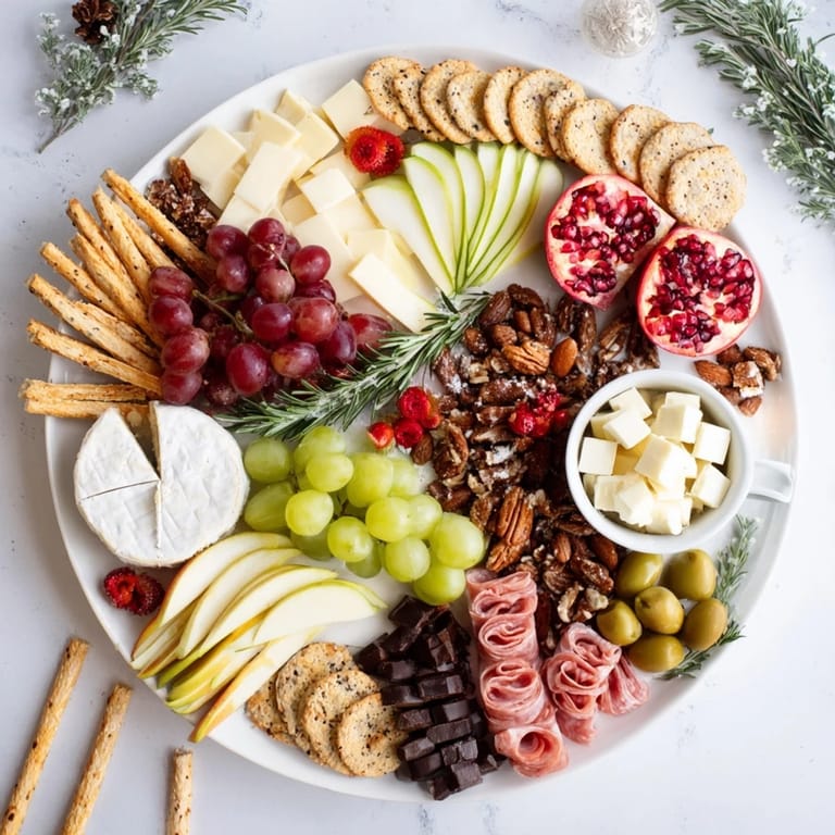 Save to Pinterest A festive, wintry-themed grazing tray featuring a beautiful selection of cheeses, charcuterie, seasonal fruits, nuts, and sweet treats—perfect for holiday gatherings.