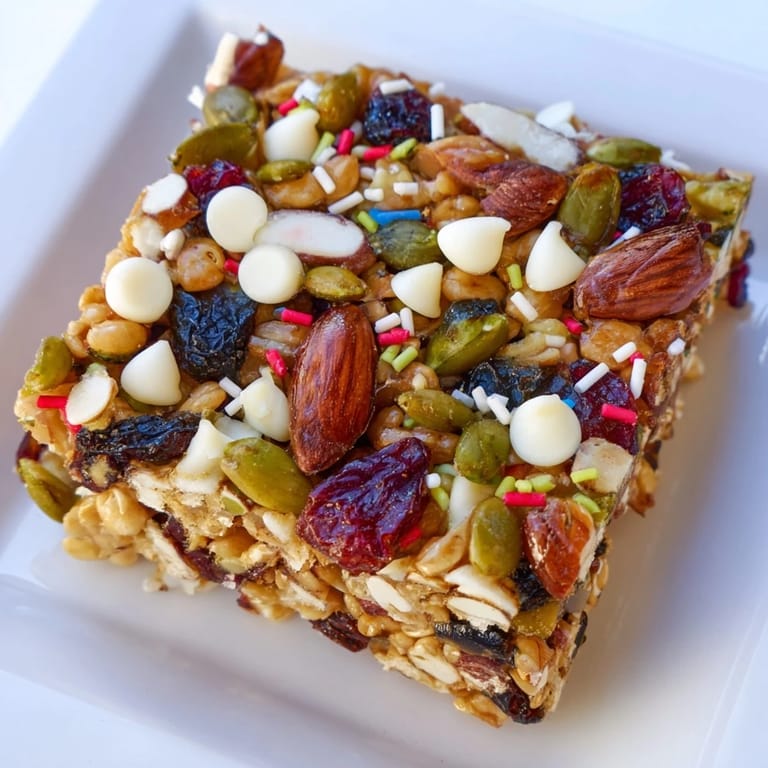 Save to Pinterest A festive, crunchy snack bar featuring a medley of nuts seeds dried fruits and white chocolate perfect for cozy winter days or holiday gatherings.
